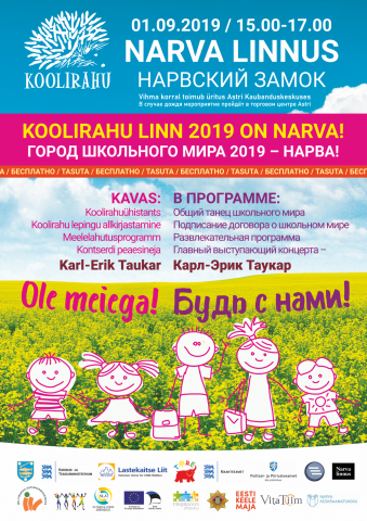 Уважаемые учителя, ученики, родители! Приглашаем всех в 1 сентября в Нарвский замок на провозглашение Школьного мира 2019. Церемония открытия и подписание договора состоится в 15.00. В мероприятии принимают участие: Департамент шоссейных дорог, Ида-Вируский центр профессионального обучения, Идаский спасательный департамент, Целевое учреждение интеграции и Дом эстонского языка, Молодежный центр Нарвы, учебный центр VitaTiim, центральная библиотека Нарвы, Нарвское отделение полиции и т.д. На территории замка будет организована продажа прохладительных напитков и еды, детей будет ждать батут и другие развлечения. После торжественного подписания договора о Школьном мире пройдет концерт известного и популярного среди молодежи исполнителя Карла-Эрика Таукара. Слоган Школьного мира этого года – Будь с нами! Будь с нами и Ты! Narva – Koolirahu 2019 pealinn!